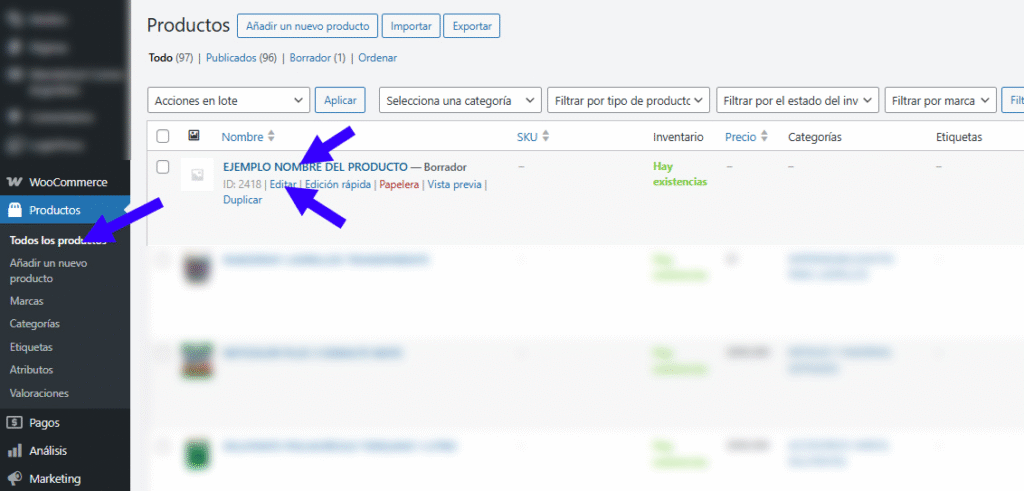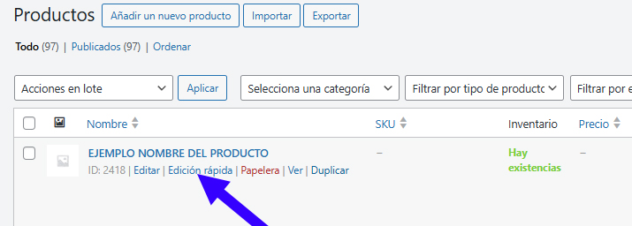 - Buscar el producto y hacer clic en su nombre o en Editar.