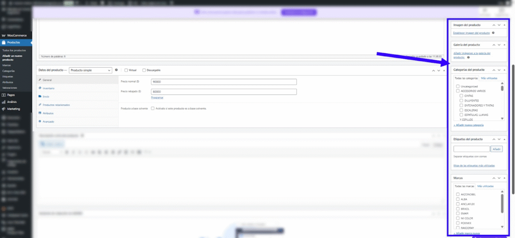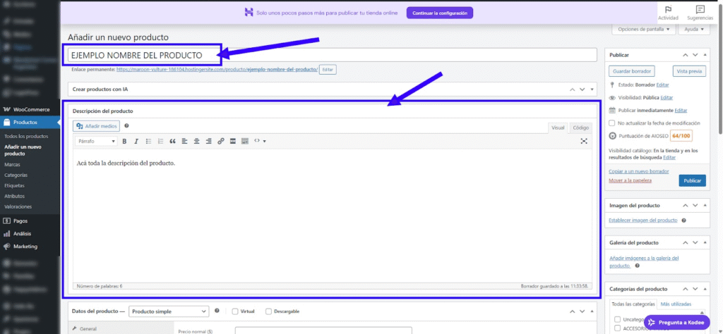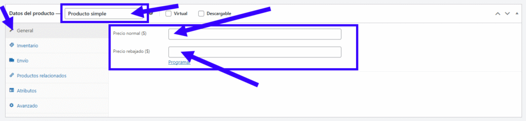 - En el bloque Datos del producto, asegurate que esté seleccionado Producto simple.