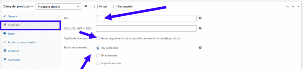 - En la pestaña Inventario, podés asignar un SKU (opcional) y controlar el stock.