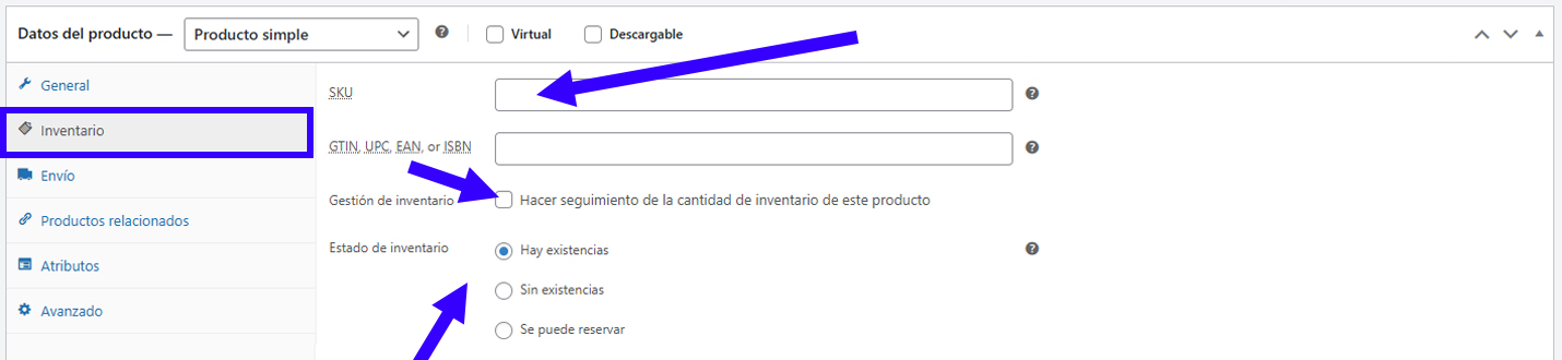 - En la pestaña Inventario, podés asignar un SKU (opcional) y controlar el stock.
