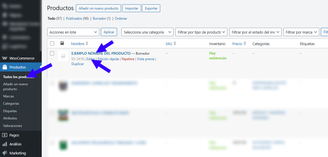 - Buscar el producto y hacer clic en su nombre o en Editar.